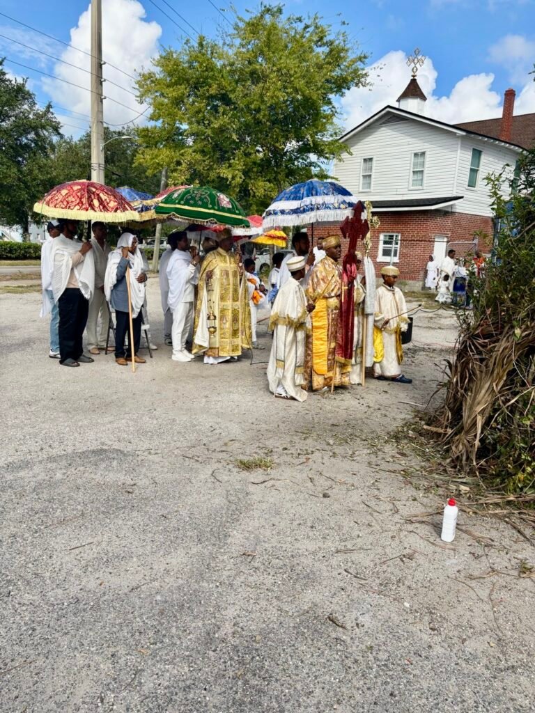 The Holy Feast of Meskel is solemnly celebrated outside the church with sacred procession, traditional liturgical garments, and prayers offered by the clergy and faithful, commemorating the discovery of the True Cross.
